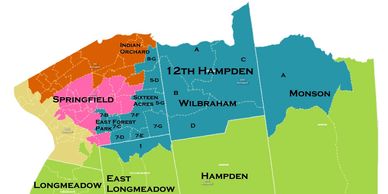 The 12th Hampden District consists of the northern part of East Longmeadow (Precincts 1, 2A, 3A, and 4A), the northwest part of Monson (Precinct A), the eastern part of Springfield (Ward 5 Precincts D and G, Ward 7 Precincts B, C, D, E, F, G, H1, Ward 8 Precincts B1 and G), and all of Wilbraham.